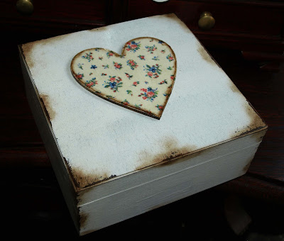 Środek wieczka wieńczy serduszko ze sklejki - takie same jak w fioletowej szkatułce, tylko ty razem umieszczone na górze.